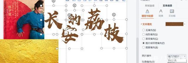 先选一个具有羊毫书写感的字体(举例“汉仪尚巍手翰”)。 使用图片填充翰墨功能,选拔 文本填充-图片不详纹理填充-剪贴板 将翰墨填充为金属质感纹理图(不错从素材网站高下载 “金箔贴图”“烫金纹理” 等素材)。