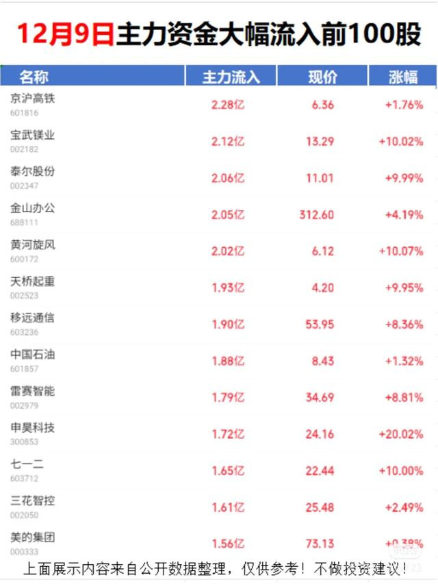 2024年12月9日,主力资金大幅流入的股票主要聚会在A股创业板阛阓和深市A股阛阓。以下是具体的股票过甚净流入额情况: