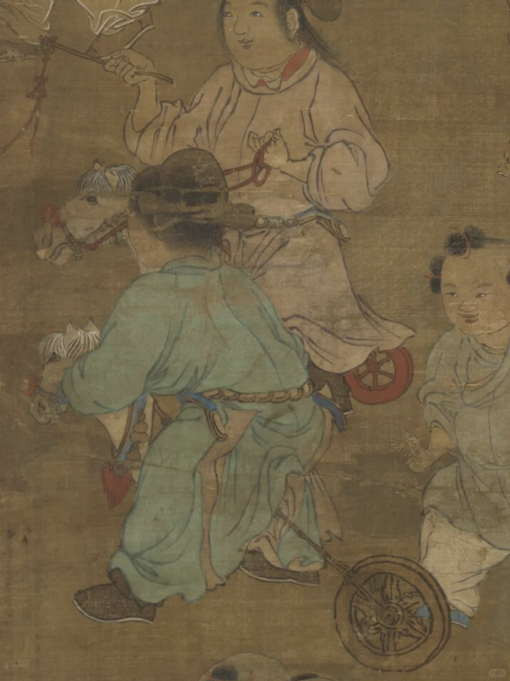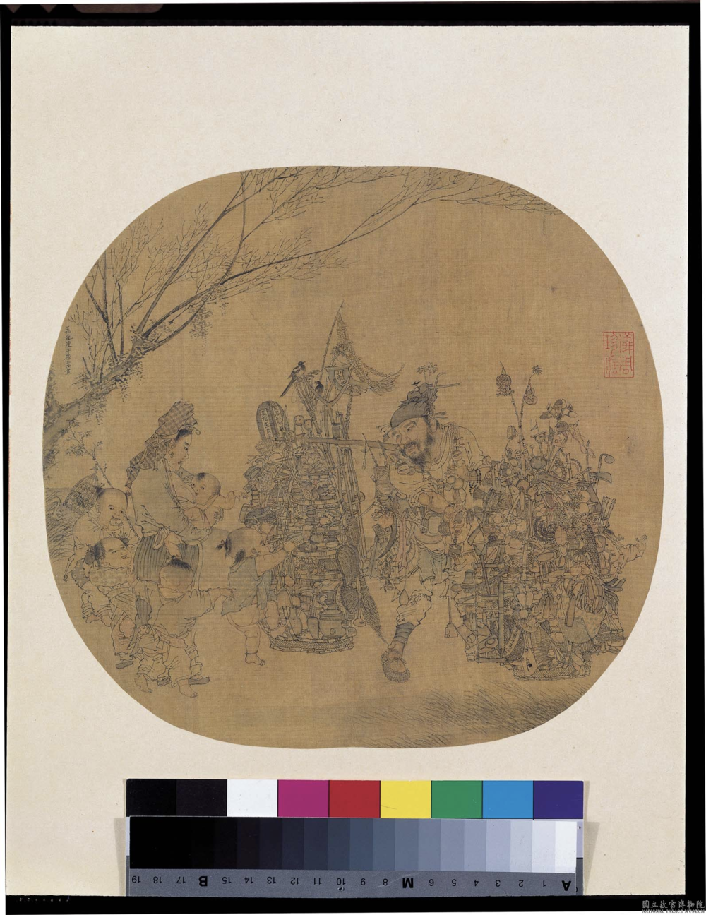 这幅画描摹的是江南乡村货郎与儿童嬉戏的气象,货担上有好多玩物