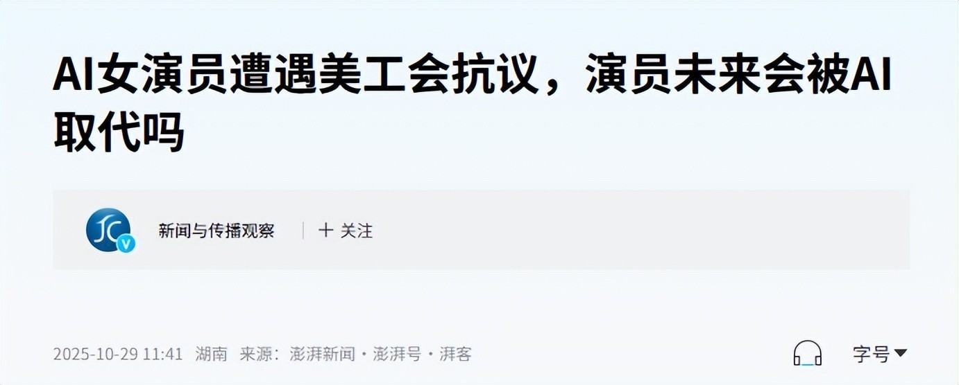 新闻与传播不雅察2025-10-29AI女演员遭受好意思工会抗议,演员翌日会被AI取代吗
