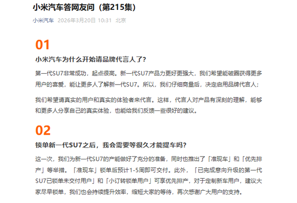 【CNMO科技讯息】3月20日开云体育,小米汽车通过官方渠说念发布“答网友问”第215集,就新一代SU7的品牌代言东说念主计策、托福周期、改配章程、试驾安排及购车权柄等用户关注的问题进行了蚁合回报。