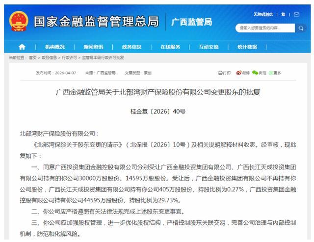 而就在三天前(4月7日),广西金融监管局发布批复称,高兴广投金控折柳受让广西金融投资集团有限公司(下称“广西金融投资集团”)、广西长江天成投资集团有限公司(下称“长江天成”)执有的北部湾财险30000万股股份、14595万股股份。