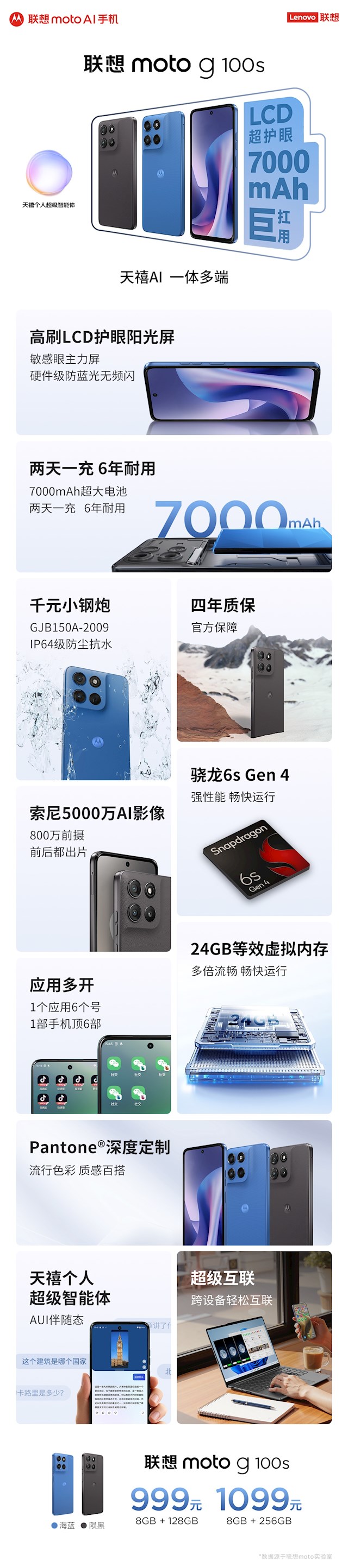 快科技11月6日音讯,联念念官方今天文告,moto g100s厚爱开售,订价是999元起。