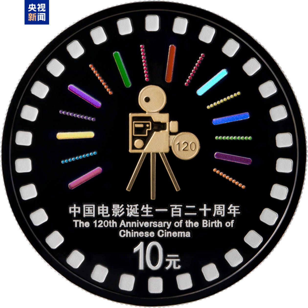 缅念念币边际的胶片齿孔直不雅叫醒东说念主们对电影载体的经典回来。金色照相机是视觉中枢,彰显电影制作的专科质感。从照相机向四周发射的多彩线条与点阵,既象征120年间中国电影生长出的多元类型、水灵故事与厚谊力量,体现艺术抒发的丰富性;也喻示电影如光般照亮生计、津润文化的精神价值。